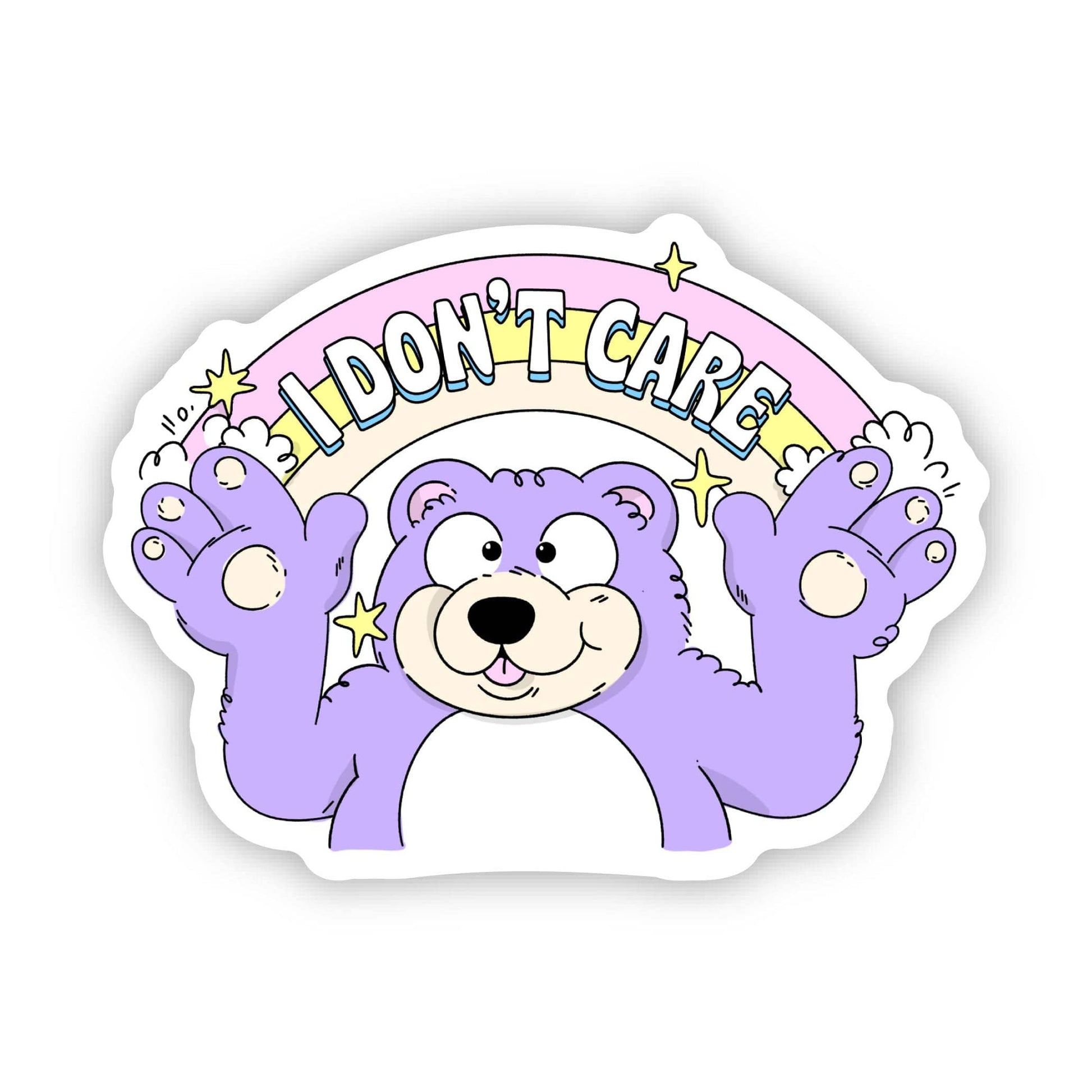 Sarcastic rainbow sticker with bear that says "I don't care." High quality vinyl sticker. Great to decorate laptops, water bottles, car windows, coolers, phone cases, journals, suitcases, notebooks, and more. Sarcastic sticker, sarcasm sticker, funny sticker.
