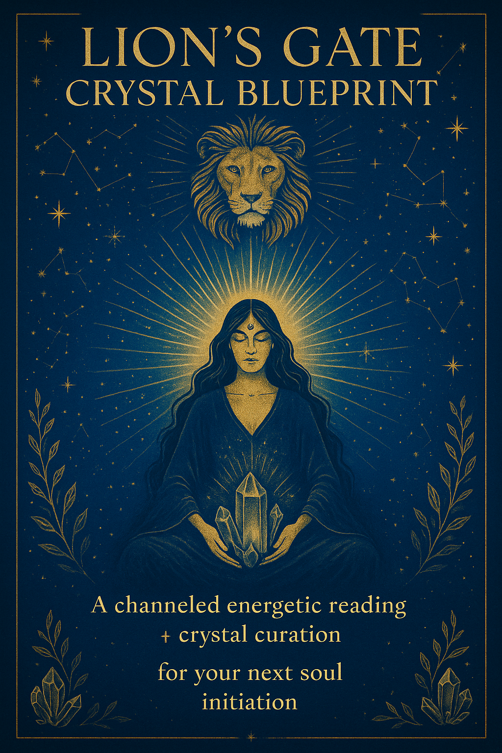 A personalized energetic reading + crystal bundle to align you with your unique frequency during the 8/8 Lion’s Gate portal, a time of cosmic rebirth, purpose amplification, and solar light activation.